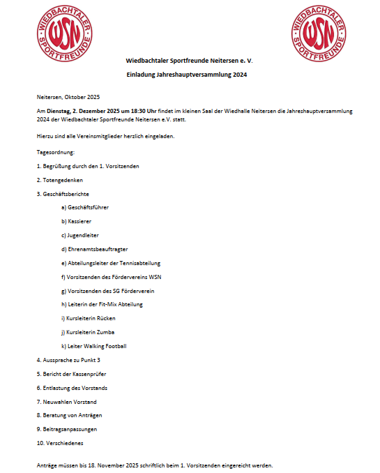 Einladung Jahreshauptversammlung WSN für das Jahr 2024 am 02. Dezember 2025 in der Wiedhalle ab 18:30 Uhr