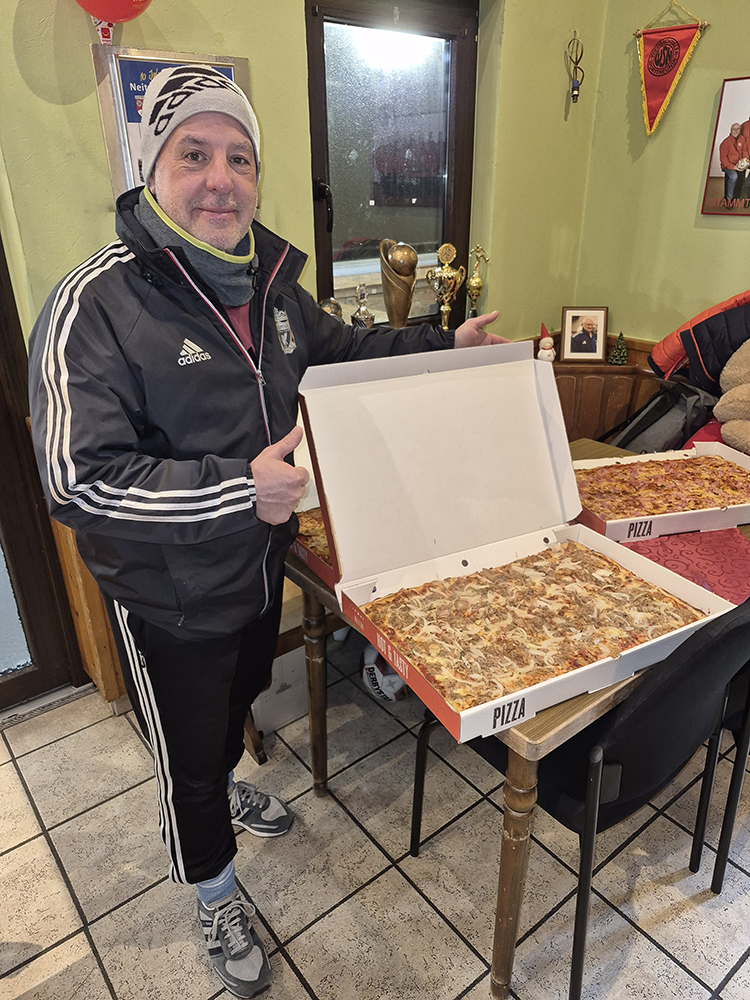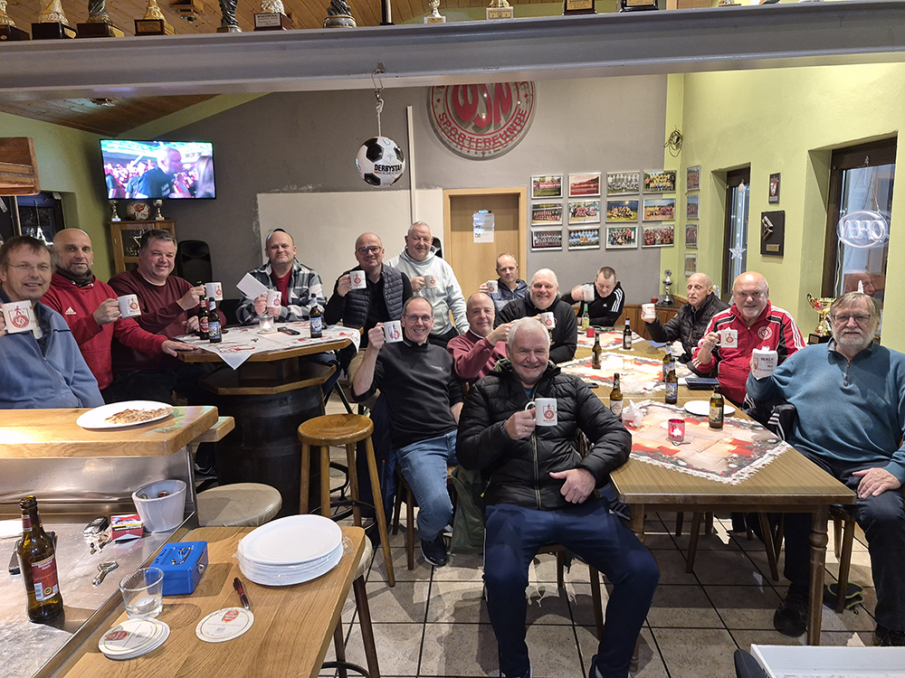 Dort sorgte unser Teammitglied Miquel für die kulinarische Versorgung. Bei Pizza und „Kelsch“ wurden ein würdiger Abschluss gefunden. Jedes Teammitglied wurde mit einer WSN-Walking-Football-Kaffeetasse beschenkt. Hier gilt unser besonderer Dank an Ulf Imhäuser als Vorsitzender des Fördervereins und an das Fotostudio-Schäfer aus Altenkirchen für die kurzfristige Herstellung und Belieferung. Ein gelungener Abend mit viel Bewegung und Geselligkeit. Dies zeichnet die Walking Football Gruppe besonders aus und bietet für alle eine Plattform, die wieder runter vom „Sofa“ möchten und unter die „Leute“ kommen wollen.