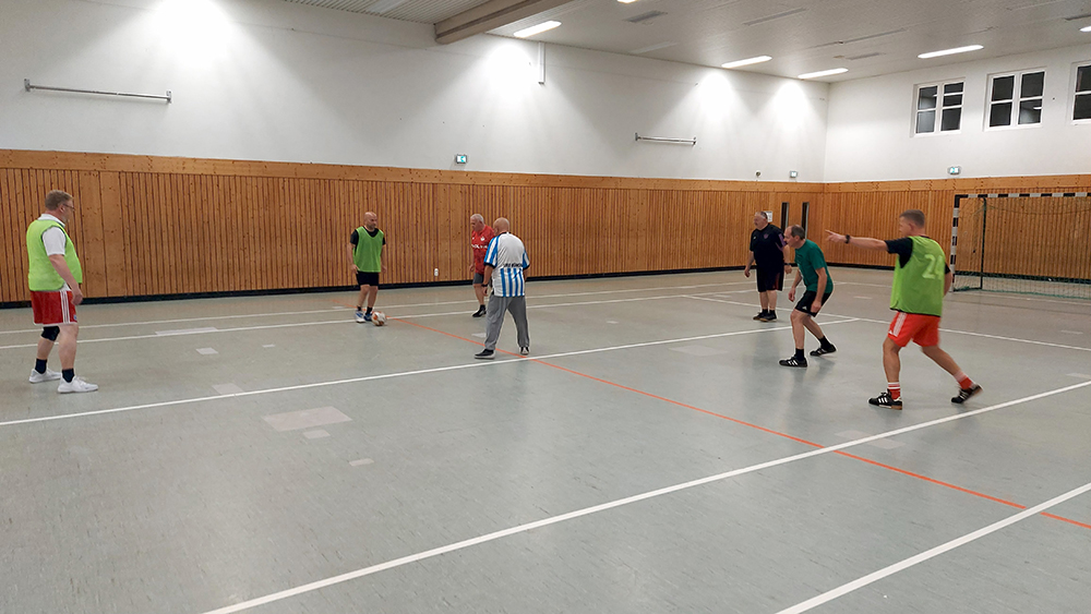 Das herbstliche Wetter veranlasste unsere Walking-Footballer in der Wiedhalle zu trainieren. Zum Aufwärmen wurden Passübungen und kleinere Spielformen geleistet. Die ein oder andere kognitive Ergänzungsübung forderte von unseren Spielern eine hohe Konzentration und Reaktionsfähigkeit ein. Diese Übungen sind sehr wichtig, um im fortgeschrittenen Alter, neben der körperlichen Fitness, die grauen Zellen anzuregen. Natürlich gab es dann zum Abschluss ein Trainingsspiel. Nach einer schweißtreibenden Einheit wurden dann im Vereinsheim „Emma“ die selbstgemachten Frikadellen-Brötchen vertilgt und das ein oder andere „Kelsch“ ölte die durstigen Kehlen. Gute Gespräche, Gemeinschaft und einfach eine gute Zeit miteinander zu verbringen, dass ist neben der sportlichen Aktivität das Benefit des Walking Football.